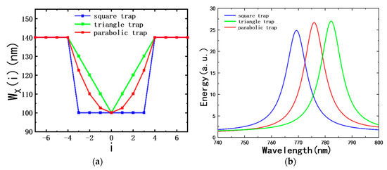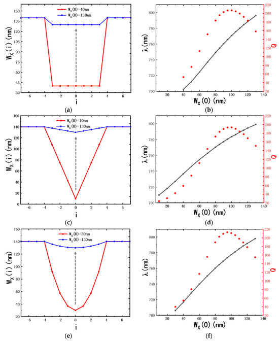 Figure 6a,c,e show the variations in WX(i) profiles for the square trap, triangle trap, and parabolic trap structures, respectively. Figure 6b,d,f show the Q factors and resonant wavelengths of the three SPT structures when the depths of the traps vary. The range of the resonant wavelengths of the three SPT structures is from 708 nm to 796 nm, corresponding to the band gap of the PNC segments at the end (refer to Figure 1c). For the three trap structures, the resonant wavelengths increase steadily when WX(0) increases. However, the Q factors reach the maxima when WX(0) is near the value of 100 nm. Among the three SPT structures, the parabolic trap structure possesses the highest Q factor (21) with WX(0) being 95 nm. The maximum Q factor of the triangle trap structure (193) is smaller than that of the other two structures (207 and 213). This might be due to the field distribution of its mode having a relatively high radiation loss. The resonant wavelengths corresponding to the maximum Q factors of the three structures are 771 nm, 784 nm, and 773 nm, respectively.