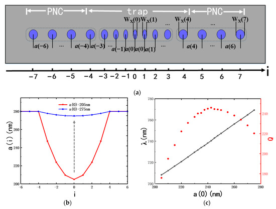 The variation range of a(0) is from 205 to 275 nm. In this range, the resonant wavelength increases steadily when a(0) increases, and the Q factors reach the maximum (246) when a(0) is 242.5 nm, at which point the resonant wavelength is 740 nm. The highest Q factor of the SS-SPT structure is 15.5% higher than the Q factor (213) of the parabolic trap structure in Section 3, as shown in Figure 8a specifically. As a(0) lies in the range from 230 to 260 nm, the Q factor of the SS-SPT structure remains above 230.