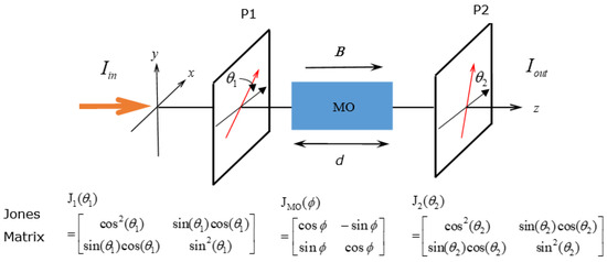 Consider the configuration shown in Figure 1. There is a magneto-optical material placed between the two polarizers, P1 and P2, with polarization angles and (with respect to the x-axis), respectively. As indicated below the figure, the polarization states can be described as Jones vectors and Jones matrices [20]. The three Jones matrices are named J1, JMO, and J2, respectively, for P1, magneto-optical material, and P2. For an incident wave field with the Jones vector , the output field