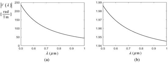 After studying the intensity modulation for a monochromatic wave case, we turn our attention to a polychromatic one. We already know that the refraction index depends on the wavelength (so-called dispersion), but when it comes to the MO effect, the strong rotary power wavelength dependence = V•B is dominant because the Verdet constant itself is strongly wavelength-dependent, as [19], where γ is the magneto gyration coefficient. In order to give a full description and correct numerical calculations, the following two formulas are used for and , which are verified empirically and adapted from the literature [22,23]. Figure 3 depicts the behavior of the absolute value of and for TGG in the wavelength range from 0.5 to 1.0 um. The much larger extent of value change for than that of is obvious.