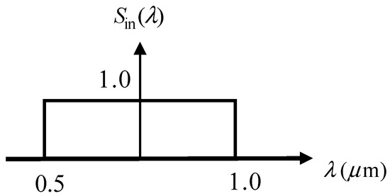 Now, we consider an incident polychromatic spectrum with a flat-top distribution ranging from to , as shown in Figure 4. Because each wavelength component experiences various rotatory powers , even at a fixed value of B, the final rotation angle is also different after traversing the MO material, as illustrated in the lower section of the figure. Thus, the final output spectrum is modulated after passing the polarizer 2, as shown schematically on the right in Figure 5. Using the superposition principle and with the help of Equation (5), the output spectrum at each wavelength is