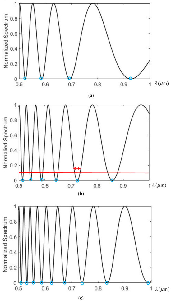 Regarding the wavelength measurement accuracy, it is determined by the way in which the dark line is placed in the wavelength. It is reasonable to assume that it can be placed in the wavelength interval for the dark line level between 0 and 10% of the peak, as the red line interval in Figure 6b shows. In this case, the accuracy is approximately ±8 nm. Note that this interval width varies with the dark line’s wavelength due to the nonlinearity of the spectrum distribution. It increases as the wavelength increases; therefore, the accuracy is higher when shorter wavelengths are used. The advantage of this scheme is that a spectrometer is not necessary to determine a wavelength when high precision is not required. Note that the ideal incident flat-top polychromatic spectrum in Figure 4 can be replaced by a real broad-band source spectrum, such as the supercontinuum white light laser. Using this ideal model is only for the convenience of the illustration. A real source will only affect the maximum of the peaks in the output spectrum and have no effect on the ticks of OFR. Thus, the performance of this scheme will not be affected too much. Neither the backreflections of polarizers (if any) will affect this OFR scheme for the same reason.