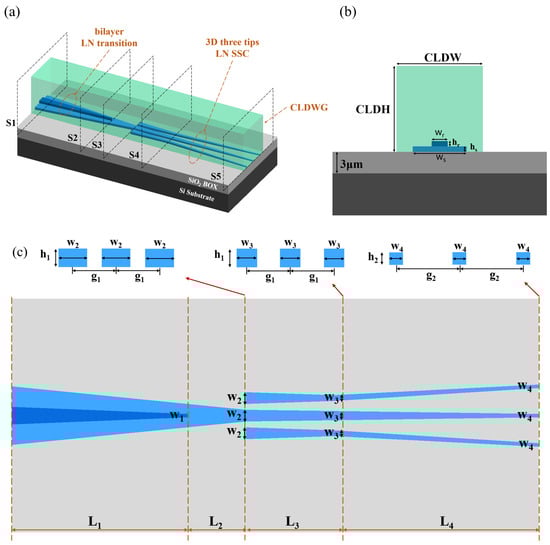 The schematic structure of the multi-tip edge coupler is depicted in Figure 1, consisting of three main components: a bilayer LN inversely tapered waveguide, 3D three-tip tapered waveguides in LNOI, and a SiON CLDWG. The bilayer LN inversely tapered waveguide is partitioned into two sections. Initially, the upper ridge’s width decreases to form the upper inversed taper. Subsequently, the lower slab width reduces to create the lower inversed taper. The 3D three-tip taper waveguides connect to the bilayer inversed taper waveguide via a slab taper. The three-tip taper waveguides can be divided into two parts. Firstly, the width of each inversely tapered waveguide linearly decreases from an initial width of w2 to a terminal width of w3, maintaining h1 and 𝑔1 for height and gap between each taper, respectively. Secondly, the width of each taper linearly decreases from w3 to w4, with the height reducing from h1 to h2 and the gap declining linearly from 𝑔1 to 𝑔2. The CLDWG defines the shape and effective index of the mode profile at the coupler’s facet while preventing energy leakage into the substrate beneath the buried oxide (BOX).