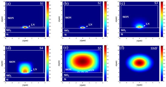 (a–e) Mode field distributions at cross sections S1–S5 (TE mode). (f) Mode field distribution of SMF.