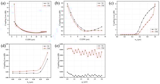 Simulated coupling loss as a function of (a) CLDWG height, (b) CLDWG width, (c) 𝑤4, (d) h2, and (e) 𝑔2. Simulation wavelength: 1550 nm.