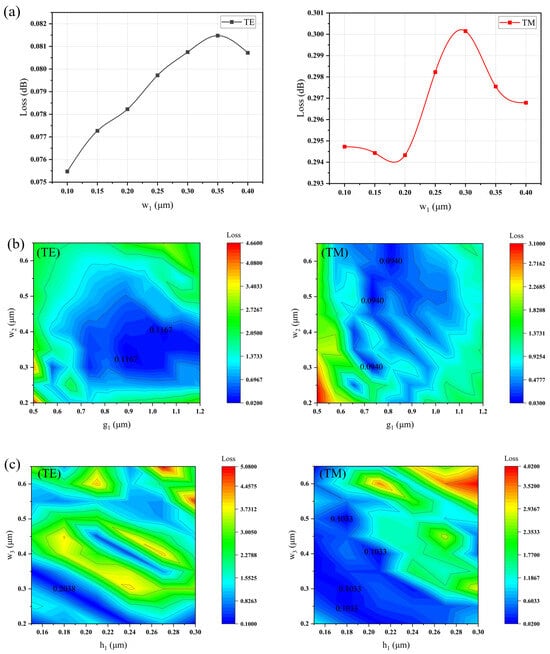 Individual parameter sweeps are conducted one by one while maintaining the other parameters at their initial values. The sweep for 𝑤1 spans from 0.1 to 0.4 μm, and the resulting transmission loss at a wavelength of 1.55 μm is depicted in Figure 4a. Considering fabrication precision [], 𝑤1 is set at 0.12 μm, aiming for decreased mode transform loss during the mode conversion from the upper ridge taper to the lower slab taper.