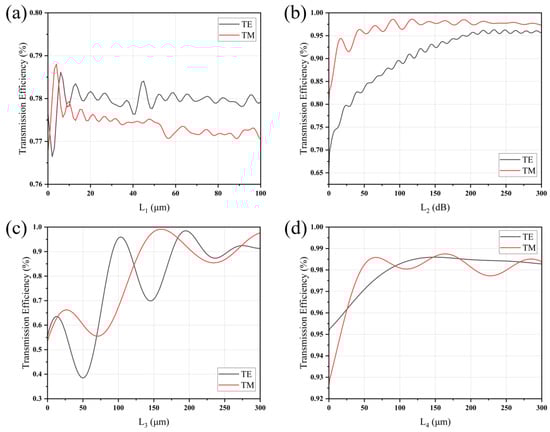 Under the given conditions, a series of scans are performed using the “propagation sweep” function within the EME method, targeting the lengths of the four taper sections individually. Initially, with L2, L3, and L4 set at constant values of 300 μm, considered sufficiently large lengths, the scan focuses on L1. As illustrated in Figure 5a, it is observed that the transmission efficiency of the TE mode stabilizes after reaching L1 > 50 μm, and for TM mode, L1 needs to reach 60 μm.