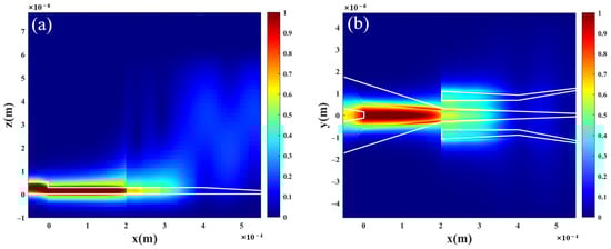 Mode propagation in the three-tip edge coupler at the wavelength of 1550 nm: (a) XZ section and (b) XY section.