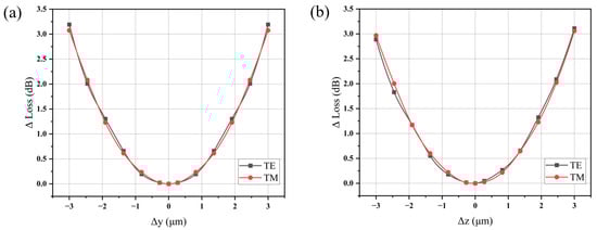 In practical applications, alignment errors between the optical fiber and the coupler are expected due to stage movement inaccuracies. Figure 7 illustrates the overall coupling loss at a wavelength of 1.55 μm for the three-tip edge coupler, concerning misalignment in both the horizontal (Y) and vertical (Z) directions. For TE mode, the misalignment tolerance for 1 dB loss penalty is ±1.62 μm in the horizontal direction, and in the vertical direction, the misalignment tolerance for 1 dB loss penalty is ±1.73 μm. For TM mode, the misalignment tolerance for 1 dB loss penalty is about ±1.76 and ±1.74 μm in the horizontal and vertical direction, respectively. Such misalignment tolerances in both horizontal and vertical directions are easily achievable by the modern alignment technique.