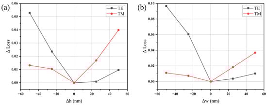 The simulated fabrication tolerance of the designed edge couplers at the wavelength of 1550 nm: (a) vertical (𝛥h) and (b) horizontal (𝛥w).