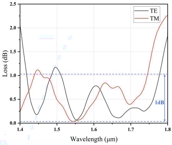 We conducted simulations to assess the wavelength dependency in the overall coupling efficiency between the coupler and SMF, represented in Figure 9. For the TE mode, 1 dB bandwidth is 270 nm, achieved between 1509 and 1779 nm. For the TM mode, the 1 dB bandwidth is 288 nm, ranging from 1457 to 1745 nm. The results indicate superior overall coupling efficiency at longer wavelengths. An important observation is the slight oscillation in the overall coupling efficiency of the four-tip edge coupler, attributed to the Fabry–Pérot resonance between the end faces of the multi-tip edge coupler.