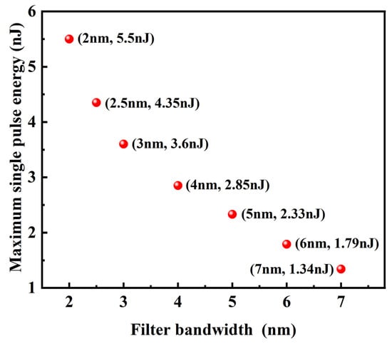 Considering Figure 3, this does not mean that the narrower the filter bandwidth, the greater the increase in mode-locking monopulse energy. In fact, when the filter bandwidth is less than 2 nm, the conversion rate between the pulse energy and the system gain is very low due to the huge energy loss caused by spectral filtering. When the filtering bandwidth is less than 1.5 nm, the oscillator cannot be started, even with the injection of seed light. Finally, it can be concluded that only within the scope of the available conditions is the smaller filter bandwidth beneficial for improving the maximum single-pulse energy output of the Mamyshev oscillator.