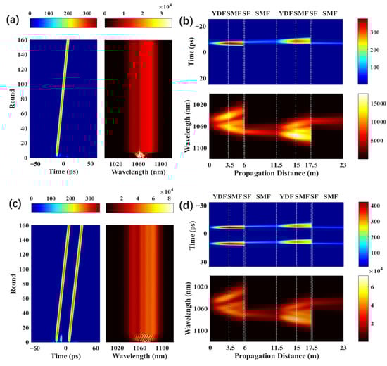 To numerically simulate the evolution of pulses in the Mamyshev oscillator, the split-step Fourier method is used, and the initial signal is injected, which consists of a Gaussian pulse and weak random noise at the bottom [22,30]. Due to its excellent noise suppression ability, it is very difficult for the Mamyshev oscillator to achieve self-start mode locking through the noise pulses generated by spontaneous emission. In fact, it is often necessary to use the starting arm, inject the seed source, or adjust the filter parameters to help the oscillator start mode locking. In this simulation, seed injection is used to start the oscillator. If the initial signal contains only Gaussian white noise, the stability of the mode-locking starting state cannot be guaranteed due to the randomness of the white noise. Therefore, the combination of Gaussian pulse and random noise at the bottom as the initial signal can be used in the simulation. The Gaussian pulse in the initial signal helps the oscillator realize stable self-start and accelerate the convergence of calculation to a stable working state [26]. After that, the intensity of the initial Gaussian-shaped pulse is found to increase sharply in the YDF section. The pulse width rapidly expands due to the normal dispersion of the gain and passive fibers. Then, the pulse is filtered by a red-shifted wavelength filter, and due to the huge energy loss caused by offset filtering, the width and intensity of the pulse will be drastically decreased [13,22,26]. The temporal evolution of the pulse as a result of the pulse propagation in the gain fibers and passive fibers continues to occur until the pulse is filtered by a blue-shifted wavelength filter.