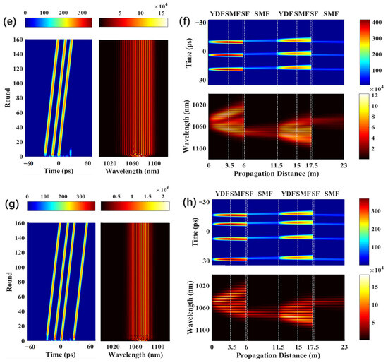 Herein, the values of and are immutably set to 5 and 16 nm, respectively. When is set to 2 nm, a stable single-pulse with high energy can be obtained. The temporal and spectral evolutions of such a pulse are described in Figure 2a,b, respectively. It can be seen that the remarkable ability to reshape the pulse and suppress noise are caused by the narrow bandwidth of the bandpass filter. When is slightly increased to 4 nm, a two-pulse bound state can be obtained, as shown in Figure 2c,d. As is increased, more noise can pass through the offset spectral filters and be amplified, and the pulses that pass through the filters share the same laser gain. Eventually, under the gain competition in the cavity, only two solitons can be stably transmitted and they would have identical peak powers. Since the parameters of the two solitons are identical, spectral interference fringes can be seen in the spectral pattern of a two-pulse bound state [31,32]. When the value of is increased to 6.5 nm, a three-pulse bound state is obtained, as shown in Figure 2e,f. In addition, when is further increased to 7 nm, the three-pulse bound state can still be formed, but the noise suppression ability decreases significantly due to the high value of . Thus, a continuous noise wave can be observed in the temporal and spectral evolution of the pulse, as shown in Figure 2g,h. For this stage, the Mamyshev oscillator operates at a critical mode-locked state, and the mode-locked state can be established, but is not stable. The saturable absorption effect of cascaded spectral filtering cannot completely filter out the existing noise, and this will lead to some of the noise being able to achieve gain amplification in the fiber laser cavity. However, due to the limitation of saturation gain in the laser system and the gain competition between pulses, the noise pulse cannot reach a mode-locking state, and finally exists in the form of continuous noise at the bottom. After this, further increasing the filtering bandwidth will cause the oscillator to enter a chaotic multi-pulse state. Due to the large overlap in the passband range of the two filters, numerous noise pulses with overlapping frequencies can pass through the filters and be amplified, resulting in a decrease in the oscillator’s saturation absorption and the emergence of chaotic pulses.
