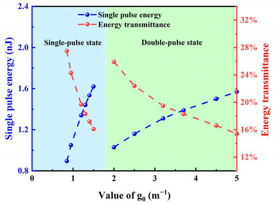 From Figure 6, it also can be intuitively observed that, in the single-pulse region with < 1.8 , the pulse energy continuously increases with laser gain, while the energy transmittance decreases accordingly. When > 1.8 , the oscillator enters a double-pulse state, where the energy and transmittance of each sub-pulse have the same trend compared with the single-pulse state.
