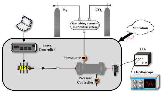 To confirm a constant pressure level within the gas cell, a piezometer was placed at the inlet of the gas cell to record the inlet pressure, while a pressure controller was placed at the outlet to record and regulate the pressure inside the gas cell. The pressure experiment was initiated only when the readings of the piezometer and the pressure controller were in agreement. It is necessary to emphasize that all pressure tests in this work were pressurized at the basis of atmospheric pressure, i.e., 0 atm, which is the atmospheric pressure. All the instruments and devices are fixed on an optical platform, and a vibration source was utilized to provide acceleration to the platform. This work is aimed at an on−site measurement of CO2 concentrations in flue gas ducts where the vicinity is characterized by strong vibrations; thus, it is necessary to set up all components in a collective vibrating environment to better simulate the field environment. A magnetic accelerometer was employed to measure the acceleration of the gas cell in real time. All tests were started after ventilating 20 min to the gas cell.