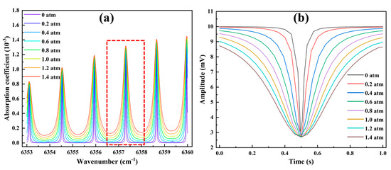 In this work, the wavelength of 1572.974 nm was chosen as the central wavelength of the absorption spectral line, which can be converted to a wave number of 6357.38 cm−1 for ease of calculation. The absorption coefficients within the wavenumber range of 6353–6360 cm−1 at different pressures are shown in Figure 3a; the peak marked with a red box was the selected line, and it can be seen that there are few strong absorption lines of CO2 around 6357.38 cm−1 within the range of ±0.5 cm−1 according to the HITRAN database [20], which indicates that the selected line is barely affected by the nearby lines of CO2. The absorption coefficients show that the peak remains constant while the trough decreases with increasing pressure, illustrating that the absorption capacity on both sides of the center wavenumber will be enhanced by pressures, whereas those of the center wavenumber are nearly unaffected. A simulation of the absorption depression of the incident light intensity is shown in Figure 3b. It is evident that the width of the absorption depression increases with increasing pressures, followed by a diminishing peak to peak. Consequently, it can be inferred that the pressure will expand the line broadening, while the line intensity exhibits the opposite.