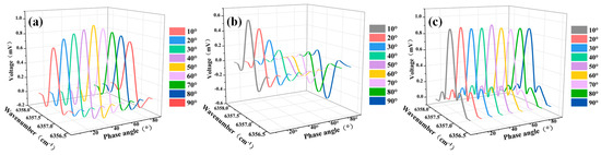 In terms of basic parameter settings, an appropriately high modulation frequency could improve the signal−to−noise ratio (SNR) and the anti−interference capability of the harmonic signal [21] yet also increase the non−linear modulation amplitude and the complexity of data processing. As such, a suitable modulation frequency of 5 kHz and a tuning frequency of 1 Hz were adopted. Regarding the phase selection, the transmitted beam was captured by the photodetector and converted to a voltage signal, which was demodulated by the lock−in amplifier to acquire two components with a phase difference of 90°, called the X−component and Y−component. The X− and Y−components and second harmonics within the phase range of 0~90° are shown in Figure 4. It can be clearly seen that an initially increasing trend of the peak to peak of the X−component with phase angle was observed, followed by a gradual decrease when reaching a phase of 50°, while a continuous decrease for the central peak of the Y−component can be found. The relationship between the second harmonic employed in this work and the two components can be described as follows:
