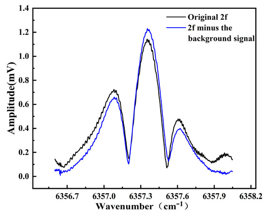 Secondly, an experimental system was configured to validate the simulation results. The 99.99% N2 was fed into the gas cell, and then the transmitted beam was measured by a photodiode after ventilating for 20 min. As shown in Figure 6a,b, the X− and Y−components with remarkable fluctuations obtained at a CO2 concentration of 0% demonstrate that there exists a background signal, which is due to the instrument noise and the presence of impurities in gases. The absorption signal was acquired and demodulated after the 30% CO2−N2 mixture mixed by the gas distribution system was continuously vented into the gas cell for 20 min. Both the original X− and Y−components are accompanied by relatively large fluctuations, while a smoother signal was derived by deducting the corresponding background, as depicted in Figure 6c,d, and a more symmetrical second harmonic, as depicted in Figure 7.