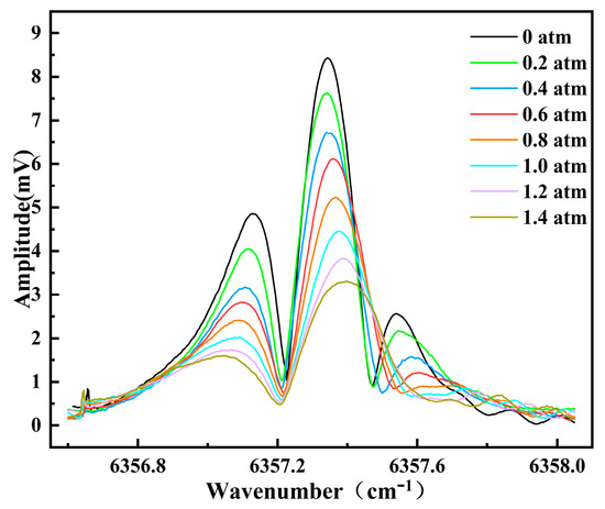 To perform TDLAS signal detection under different pressure conditions, the pressure controller fixed at the outlet of the gas cell was adjusted to maintain the pressure in the gas cell at a predetermined level. Usually, the pressure in flue gas ducts will not exceed 1.6 atm. In order to ensure the safety of the instrumentations, it was decided to conduct pressure tests within the range of 0~1.4 atm. As can be seen in Figure 8, there is a regular decline that the amplitude of the second harmonic exhibits as the pressure increases, which is consistent with the results of the simulation. Furthermore, one can observe that the central wavenumber shifts to a larger value while the spectral line becomes broader with the increasing pressure. The phenomenon of the former is possibly due to the elimination of the right−sided lobe with increasing pressures, resulting in a reduction in the symmetry of the waveform. The trend of the latter coincides with the absorption coefficient discussed in Section 3.1, indicating that the waveform of the second harmonic will be impacted by the absorption coefficient. Due to the absence of waveform symmetry, the right−sided lobe almost vanishes when the pressure increases to 1.0 atm, while the left−sided lobe remains distinct, even when the pressure reaches 1.4 atm. Consequently, the value of peak to peak was calculated by the left trough, and the central peak of the second harmonic was defined as the amplitude.