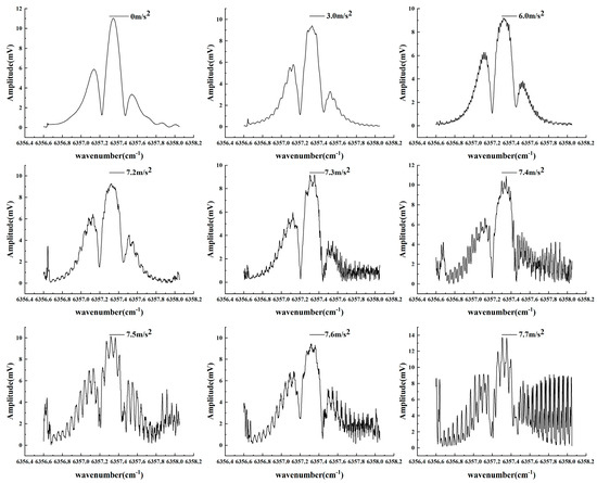 In addition to pressures, a large number of vibrations can also be produced during the operational process of the boiler, which can bring serious deflections and noises into the flue gas ducts. Accordingly, the evaluation of the adaptability of TDLAS employed in vibration environments cannot be ignored. To simulate the vibration of flue gas ducts, a vibration source was configured on the experimental platform to generate an acceleration ranging from 0 m/s2 to 7.7 m/s2. Similarly, a 30% CO2−N2 mixture was ventilated into the gas cell and then tested with different vibrations, i.e., different accelerations, and the acceleration of the gas cell was measured by a magnetic accelerometer. In addition, the pressure in the gas cell was maintained at the atmospheric pressure by the pressure controller. The corresponding second harmonics in the acceleration range of 0~7.7 m/s2 are shown in Figure 9.