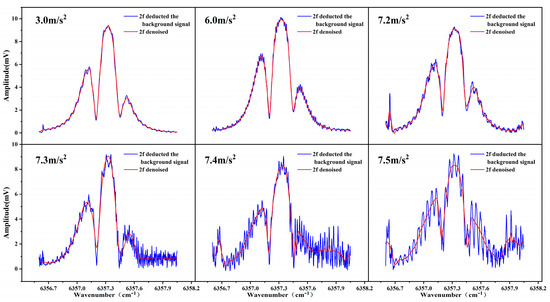 Wavelet transform is a time–frequency analysis method that decomposes a signal into wavelet coefficients at different scales and frequencies and filters out the noise in the signal by adjusting the thresholds of wavelet coefficients while preserving the main signal components. There are a variety of wavelet basis functions to be chosen, such as Haar, sym (Symlet), coif (Coiflet), bior (Biorthogonal), and so on. In addition, the level of layers can be adjusted to achieve a finer signal decomposition and noise removal. Based on multiple tests, bior3.6 was chosen as the wavelet basis function and the layer level was set to 5. The second harmonic obtained under vibration conditions were all de−noised by wavelet transform in this work. As shown in Figure 10, it is obvious that the noise is effectively suppressed until an acceleration of 7.3 m/s2. Unfortunately, a remarkable distortion of the de−noised signal can be noticed when the acceleration increases to 7.4 m/s2, indicating that it is no longer effective to de−noise at this acceleration level.