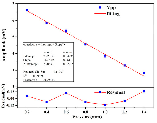 In order to investigate the correlation between the amplitude of the second harmonic and the pressure, a scatter plot of the amplitude versus the pressure of the mixture gas was produced, as shown in Figure 11, while a linear fitting was performed. The R2 of 0.998 suggests that there is a strong linear relationship between the amplitude and the pressure. Combining Figure 11 and Table 1, the residual is relatively low when the pressure is below 1.4 atm. The result shows that, although the pressure causes the right−sided lobe of the second harmonic to almost disappear with increasing pressures, it does not affect the accurate calculation of the amplitude using the left trough and the central peak. Once again, a significant negative linear correlation between the amplitude and the pressure was observed. The relative error of 4.645% at a pressure of 1.4 atm with a residual of 0.1312 mV exceeds the ideal relative error of 3%, suggesting that the pressure that this system can withstand should not be higher than 1.4 atm. To sum up, the combination of TDLAS with WMS has demonstrated high adaptability in diverse pressure environments, making it well suited for precise spectral measurements within specific pressure ranges.