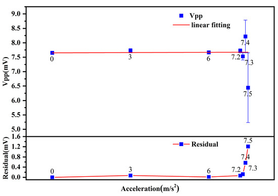 Since the concentration of the CO2−N2 mixture was kept constant at 30% during the vibration experiment, the amplitude of the second harmonic should theoretically remain at the same level. By calculating and fitting the amplitude at different accelerations, residuals were found to rise as acceleration increased, as shown in Figure 12. Residuals were maintained within the desirable range of ±0.2 mV when the acceleration did not exceed 7.3 m/s2. As indicated in Table 2, a poor SNR and residual were acquired at an acceleration of 7.4 m/s2, where an accurate measurement could no longer be made due to the huge error. Notably, there is a distinct advance in the SNR when the acceleration increases to 7.5 m/s2, which is better than that of 7.4 m/s2. The phenomenon is probably due to the fact that the wavelet transform has a better effect of noise reduction on the former, and the de−noised waveform had already been severely distorted. In summary, the maximum acceleration that the system can sustain under the current experimental conditions is 7.3 m/s2.