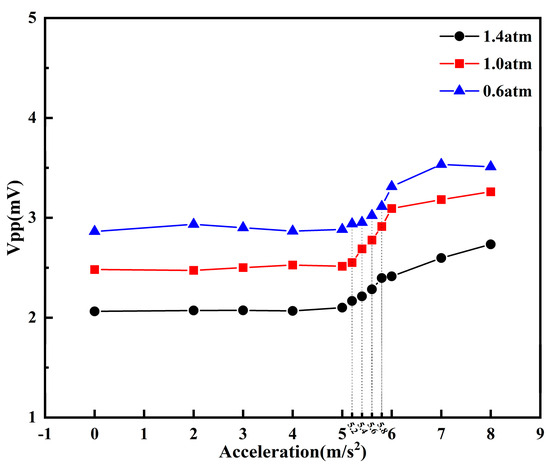The amplitude of the second harmonic within the acceleration range of 0–8 m/s2 at the pressures of 0.6 atm, 0.8 atm, and 1.4 atm.