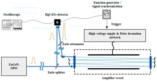The amplifier was transversely excited at a repetition frequency of 0.25 Hz and a voltage of 70 kV. It had an active volume of 20 mm × 20 mm × 600 mm and was UV-preionized. The pressure of the mixture inside the amplifier was 4 atm, and the mixture ratio of CO2:N2:He was 1:1:10. The discharge was triggered by external signals with a time delay of 95.35 μs.
