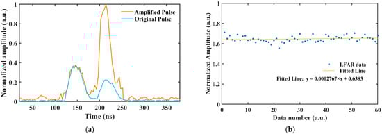 By controlling the discharge, the comparison of waveforms with and without amplification was achieved. The blue curve in Figure 2a represents the original waveforms of pulse pairs without amplification at detector gain level 6 (−4.2 dB). The first pulse was a sample of the original pulse, whereas the second pulse was the pulse that passed through the vessel. The two pulses have the same shape, with a width of 35 ns. The latter-to-former-amplitude ratio (LFAR) was 61.8%, as determined by the ratio of the splitter, attenuator, diffraction, etc. This contrast in waveforms was set up merely as a criterion case without amplification. The stability of the measured amplitude ratio of pulse pairs is shown in Figure 2b. The calculated average amplitude ratio was 0.65, and the standard deviation was 0.0048, which was only 0.7% of the average value. Despite small random deviations in the ratios, the fitted slope remained at a near-zero level, indicating that the single-detector acquisition method based on the optical path difference allowed for an intuitive amplification analysis.