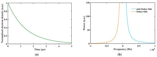 where is defined in , which describes the decline in the electron density within microseconds in Figure 4a. represents the frequency shift from the line center. was calculated as according to (4). The calculated power spectrum after the total six-pass amplification was plotted in Figure 4b. In contrast to plasma generated by a rapid laser-breakdown process, declined within a few microseconds. Nonetheless, in the duration of pulse amplification lasting dozens of nanoseconds, the electron density underwent minor changes, and the theoretical phase shift in the plasma is quasi-symmetric relative to the central frequency. The fall-off on the anti-Stokes side was as fast as that on the Stokes side. Summarizing the discussions in Section 3.2 and Section 3.3, the plasma absorption and plasma-induced phase shift of the incident pulse both had an influence on the amplitude and the frequency distribution. As the broadening in the power spectrum (<<1 MHz) occupied a minor scale compared with the line width of the seed pulse (>100 GHz), the plasma absorption effect dominated the pulse width compression.