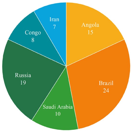 The TDS-1008 system (BATOP GmbH, Jena, Germany, Figure S1), driven by a Mai Tai femtosecond laser (Spectra-Physics, Milpitas, CA, USA, with a wavelength of 780–980 nm, a pulse width of 80 fs, and an output power of 1.5–2.5 W) was used to conduct the THz-TDS measurements. The time domain signals were Fourier transformed to the frequency range of 0.2–2.5 THz, with a signal-to-noise ratio higher than 65 dB. The poly-4-methyl-1-pentene (TPX) cell adopted in the experiment had dimensions of 46 mm × 46 mm × 3 mm (length, width, and thickness, respectively). Every sample in the cell was placed into the THz-TDS chamber for measurement, and then when switching to a new sample, the previous sample was taken out, and the cell was cleaned and dried, and then injected with a new sample. The number of crude oil samples from different countries measured in the experiment is shown in Figure 1.