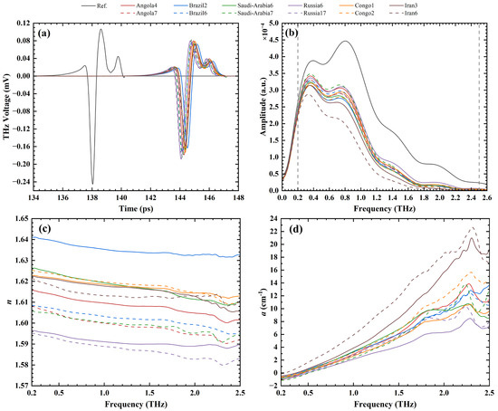 Terahertz spectra of crude oil samples (two samples of each origin were taken randomly). (a) Time-domain spectra of crude oil samples; (b) frequency spectra of crude oil samples; (c) refractive index spectra of crude oil samples; (d) absorption coefficient spectra crude oil samples.
