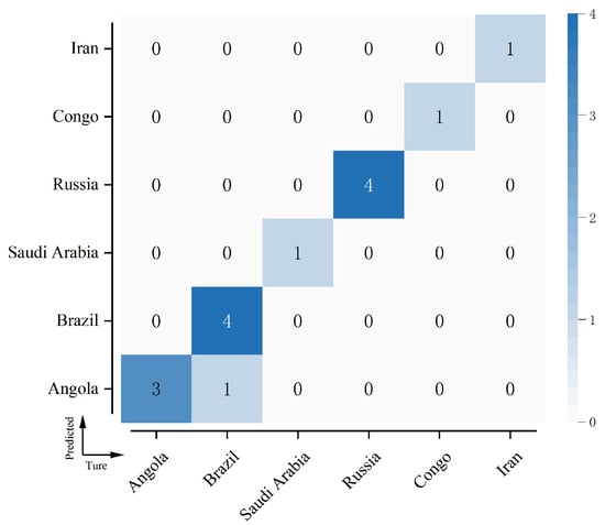 For countries for which the number of crude oil samples was less than or equal to 10, one sample was randomly chosen for testing, while the remaining samples were the training set. For countries with more than 10 crude oil samples, the training and test sets were divided at a ratio of 4:1. The k-fold cross-validation with k = 5 was implemented to validate the model. In this study, the training set data were divided into five mutually exclusive subsets utilizing fivefold cross-validation, among which one was selected for model verification and the remaining four were used for training in each iteration. This process was repeated five times, with a different subset acting as the validation set each time. The average classification accuracy of the five iterations was 97.14%. The confusion matrix of the test set, depicted in Figure 4, serves as a visual comparison between the actual category and the model prediction category. The figure reveals that only one sample was misclassified. The experiment was carried out 20 times and the average classification accuracy was 96.33%.