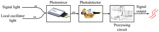 Photodetectors cannot directly obtain the frequency and phase information of light, but interference occurs when two beams of light overlap with each other. By detecting changes in interference intensity, the phase information of light can be inferred, and then the frequency information of that light can be obtained. Therefore, photodetectors utilize interference phenomena to obtain the phase and frequency information of light waves, in order to achieve coherent detection. In Figure 1, the principle diagram of coherent detection is shown. The signal light and local oscillator light are mixed in the optical mixer, and then the photodetector converts the optical signal into an electrical signal. After circuit processing, the required information is extracted [17].