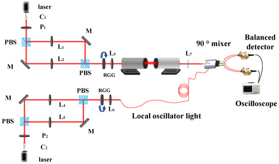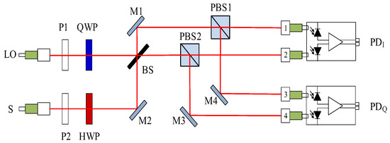A balanced heterodyne detection schematic diagram is shown in Figure 2. The local oscillator emits a laser beam that first travels through the polarizer P1 with an x-axis polarization direction. After that, it travels through a quarter wave plate, where it forms an angle to the x-axis of 45 degrees. The signal light laser beam travels through polarizer P2, which is in the same polarization direction as P1, and after passing through a half wave plate, it forms an angle difference of 22.5° with respect to the x-axis. Subsequently, the two light beams are divided into four beams via PBS1 and PBS2, respectively, after being combined through BS. The I and Q electrical signals can then be output using a balanced detector after the four light signals have formed a 90° phase difference.