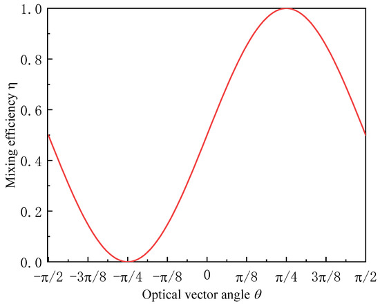 Taking θ as a variable between 0 and can simulate the situation of signal light with different polarization states imposed on it. The ratio of the amplitude of the in-phase component and the orthogonal component of the output signal is how the mixing efficiency is expressed in the case of an ideal phase difference, as per Formula (25). The mixing efficiency formula is expressed in terms of the output power ratio [18] when looking at output power from the standpoint of its effect on mixer performance.