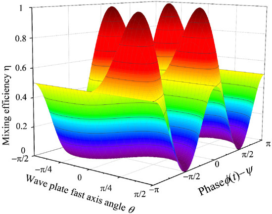 Consequently, Formula (48) can be used to analyze and simulate the effect of signal polarization on mixing performance, as seen from the standpoint of output power. Figure 4 illustrates that the signal light entering the mixer is in a circularly polarized state when there is a 45-degree angle between the fast axis of the quarter wave plate and gravity. At this point, the output signal power reaches its maximum, meaning that the relative mixing efficiency reaches peak 1. The signal light becomes elliptically polarized when the quarter wave plate’s fast axis is positioned at a different angle, and, as this angle increases, the mixing efficiency decreases as a result of frequency variations. Therefore, circularly polarized light can be thought of as an optical signal carrier in space laser communication systems in order to achieve efficient mixing.