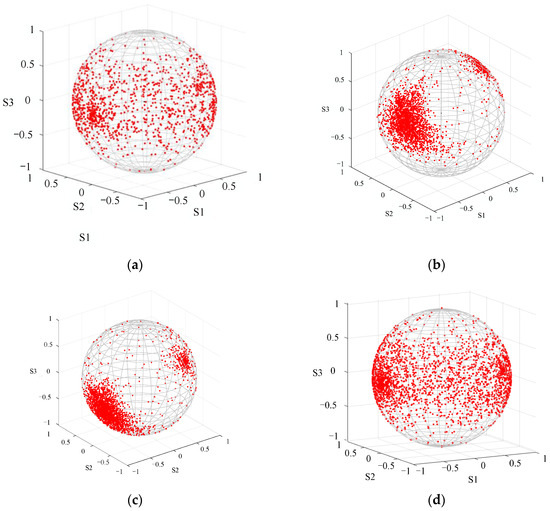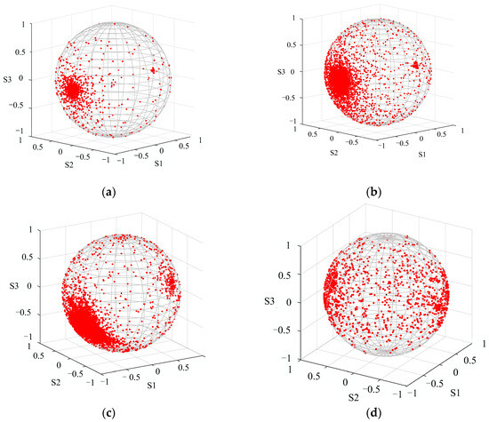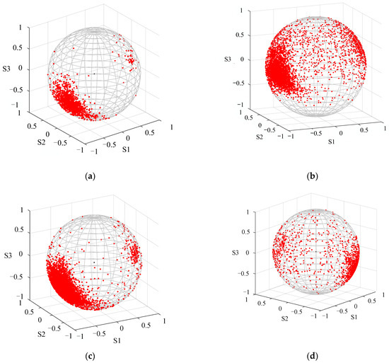 Applying the same technique can produce local oscillator light with varying polarization states when the EGSM beam signal is circularly polarized. From Figure 10a it can be seen that the data point of the signal light is close to the south pole of the Banga sphere, which agrees with the distribution of circularly polarized beams on the Banga sphere. Similarly, from Figure 10b–d, it can be seen that circularly polarized local oscillator light, linearly polarized local oscillator light, and elliptically polarized local oscillator light are, respectively, generated.
