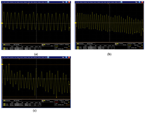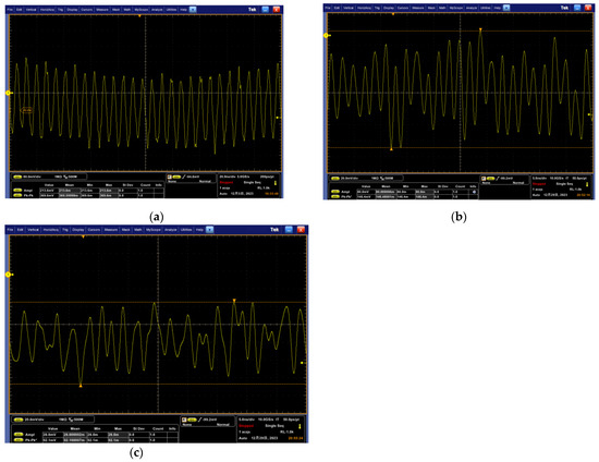 When the signal light’s EGSM beam is linearly polarized, the output power of the signal light laser was adjusted to about 1.3 μW, and the output power of the local oscillator laser was fixed at 1.5 mW. The intermediate frequency signal waveform obtained using the Tektronix DPO5204B oscilloscope is displayed in Figure 9.