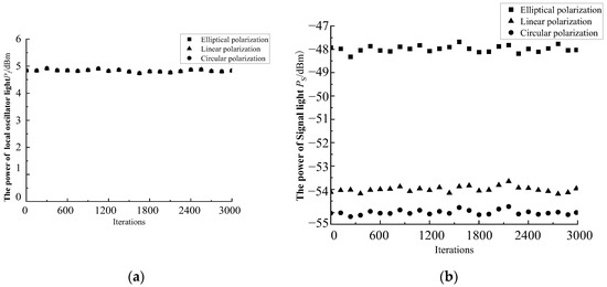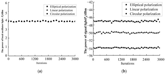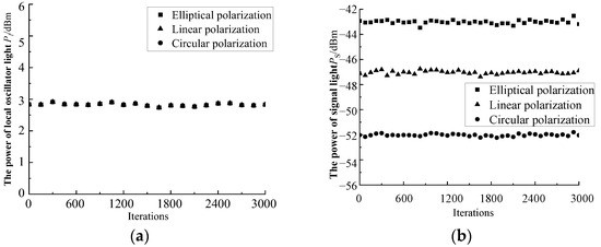 Measurement curves of signal light and local oscillator power under different polarization states of EGSM beams. (a) Measurement curves of local oscillator power under different polarization states of EGSM beams; (b) measurement curves of signal light power under different polarization states of EGSM beams.