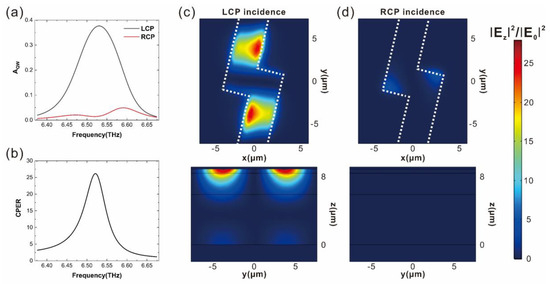 Figure 2a,b demonstrate that in the frequency range from 6.37 to 6.68 THz, the absorptance of LCP light by the QWs significantly exceeds that of RCP light. Notably, at 6.52 THz (λ = 46 µm), the CPER attains a maximum of 26, coinciding with the peak absorptance of 0.373 for LCP light. Figure 2c illustrates how LCP light resonantly excites a pronounced local field between the chiral antenna and the metal plane. This local field, characterized by a substantial Ez component, overlaps the QWs in the photosensitive region, resulting in a marked increase in absorptance. The genesis of this local field is an SPP wave at the interface between the chiral antenna and the GaAs top contact layer. For normally incident light, two SPP waves propagating in the positive y-direction and negative y-direction are excited. Conversely, Figure 2d reveals that RCP light fails to effectively excite the SPP wave, resulting in a considerably lower field intensity at the QWs and diminished absorptance. This remarkable discrepancy in the absorption rates of LCP and RCP light facilitates high circular-polarization discrimination. Furthermore, the absorptance of LCP light is observed to be over 12 times greater than that of a conventional 45°-edge-facet-coupled device. Therefore, the device under discussion exhibits not only a high capacity for circular-polarization discrimination but also an amplified absorption in the case of the principal circular polarization.
