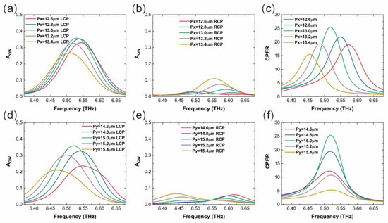 The absorption and CPER spectra, derived from modifications in the structural period along two axes. (a–c) illustrate the outcomes of altering the period Px in the x-direction, and (d–f) display the effects of adjusting the period Py in the y-direction.