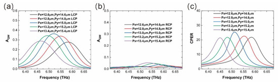 Integrating twisted metal strips of different structural parameters together is a way to increase the bandwidth of the circular-polarization detector. We conducted additional research and analysis on the effects of Px and Py on the circular-polarization-selective absorption of the device. Exploiting the impact of periodicity variations, it is expected that arranging twisted metal strips with different Px and Py values on the same mesa would facilitate the broadening of the bandwidth of circular-polarization-selective absorption. Figure 5 presents the spectra for the LCP absorption, RCP absorption, and CPER for five combinations of Px and Py. Basically, as Px and Py increase, the absorptance peak for the principle circular-polarization light (LCP in this case) and the peak of CPER are both redshifted. Therefore, if we integrated these five twisted metal strips together, the bandwidth of circular-polarization-selective absorption would be expanded from 1.35 THz to 2.25 THz. This strategy promotes the bandwidth expansion of the device.