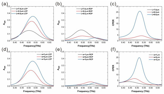 The research further encompasses an analysis of how L and W influence the circular-polarization-dependent absorption. Figure 6a,b elucidate the effects of varying L on the absorption spectra for LCP and RCP light, as well as on the CPER. As shown in Figure 6c, when L is approaching 7.8 µm, the CPER correspondingly decreases to almost 1. The co-polarization and cross-polarization in the reflected wave caused by the structure cannot produce coherent cancellation or coherent construction here. A similar trend is observed with variations in W, as shown in Figure 6d–f. The decrease in W results in the obvious decrease in structural chirality. However, despite any changes in W or L, an interfacial overlapping region, the part defined by Lc in Figure 1c, persists between the two ribbons forming the structure, thereby making it impossible to reach the point where chirality thoroughly disappears. As W increases, the structure’s chirality of structure design intensifies, leading to a corresponding rise in the CPER. Notably, the CPER attains its peak value when W = 3 µm. In the realm of cross-polarization radiation, it is observed that the parameters L and W play pivotal roles in determining the CPER. These circular-polarized-dependent optical properties arise from the co-polarized and cross-polarized oscillatory currents in the 2D chiral metamaterial, functioning akin to intersecting dipole antennas. The structural parameters L and W determine the amplitudes and phases of these dipole antennas, significantly influencing the CPER. A critical observation is made at specific parameters, precisely L = 8.61 µm and W = 3.14 µm, where the most significant variation in the field strength is noted, as illustrated in Figure 2c,d. For LCP light, the cross-polarization radiation engages in destructive interference with the principal polarization radiation. In contrast, for RCP light, a constructive interference is noted with the principal polarization radiation, culminating in an optimized maximum CPER.