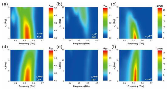 The incident angle dependence of the chiral antenna integrated on-chip THz circular-polarization detector was also studied. During oblique incidence, the incident light acquires a lateral wave vector, equating to lateral momentum. Consequently, the momentum-matching condition is modified to , where n = ±1, 2, 3… For the incident light inclining in the y-z plane within a 0°~10° angle range, the lateral wave vector created by the oblique incidence, which is 2.37 × 104 1/m, is much smaller than that acquired from the grating of the chiral structure, which is 4.21 × 105 1/m. Consequently, the peak absorption in the SPP mode remains stable despite changes in the incident angle. In the x-z plane, alterations in the incident angle do not affect the resonance wavelength of the SPP mode, leading to only minor variations in the absorption peak position across different incident angles. However, the incident angle affects both principal and cross polarization interference, causing the CPER to decrease as the angle increases. As shown in Figure 7, the device maintains remarkable performance consistency within an oblique incidence angle. The CPER remains higher than 10 when the incident angle varies ±5°. This incident angle dependence ensures that our device is useful in practical applications.