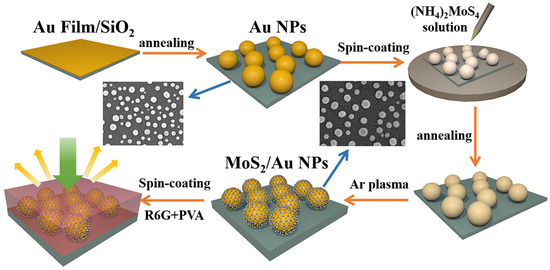 A schematic diagram showing the preparation process of the Au NPs and MoS2/Au NP samples is shown in Figure 1. It mainly consists of the following steps: 1. A thermal-evaporation system (1 Å/s rate, 10−3 Pa) was used to deposit about a 12 nm Au film on the SiO2 plates. 2. The SiO2 plates with gold films were placed in a quartz tube at a pressure of 10−3 Pa, and then the quartz tube was heated to 600 °C with a flow of Ar/H2 of about 100/20 sccm for the annealing treatment. After this process, the gold film transformed into randomly distributed Au NPs. 3. A mixture of ethylene glycol (1 mL) and high-purity (NH4)2MoS4 (0.01 g) was ultrasonically treated for 20 min until they entirely dissolved, then the (NH4)2MoS4 solution was spin-coated onto the Au NP samples using a spinner with a rotation speed of 2000 rpm for 3 min. 4. In order to remove sulfide in the precursor solution and obtain MoS2, we continued annealing the samples at 500 °C with the gas flow (Ar/H2 about 80/20 sccm). After the samples cooled to an ambient temperature, a MoS2 film formed on the surface of the Au NPs. 5. The samples were then treated with Ar plasma (13.56 MHz RF source) with power of 10 W and a pressure of 10 Pa, which thins down the MoS2 film on the Au NPs to a monolayer. 6. The random laser studied here is based on the waveguide effect. We mixed 40 mg/mL polyvinyl alcohol aqueous (PVA) solution and 3 mg/mL R6G aqueous solution in a 1:1 volume ratio. Then, the mixed solution was ultrasonically treated for 20 min until they were completely mixed. The mixed solution was spun onto the surface of Au NPs and MoS2/Au NPs samples to obtain the random laser samples. R6G serves as the gain material, Au NPs or MoS2/Au NPs serve as multiple scattering, and PVA forms the waveguide layer. When the pump laser is irradiated on the structure, light is strongly scattered by the Au NPs or MoS2/Au NPs. A large part of the scattered light was reflected totally back at the PVA/air interface to propagate within the active waveguide and scattered further by the Au NPs or MoS2/Au NPs, which experiences strong amplification through stimulated emission, through which a random lasing can be generated [32].