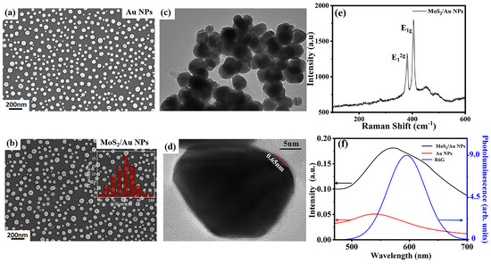 SEM image of Au NPs (a) and MoS2/Au NPs (b) (inset is a particle size distribution statistical chart of MoS2/Au NPs); (c,d) TEM images of MoS2/Au NPs with different resolutions; (e) Raman spectra of MoS2/Au NPs; (f) the UV−vis absorption spectra of Au NPs (red), MoS2/Au NPs (black), and PL spectrum of R6G (blue).