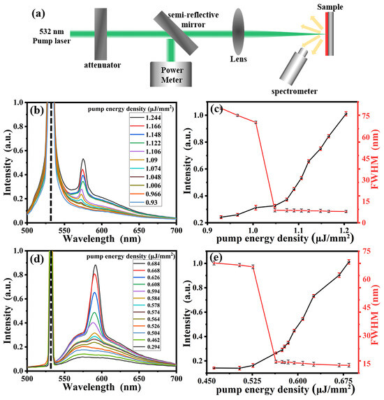 (a) Schematic diagram of the experimental setup; (b,d) the emission spectra of the Au NPs (b) and MoS2/Au NPs (d) lasing samples at different pump energies; and (c,e) the lasing peak intensity and FWHM of the corresponding emission peak as a function of the pump energy.